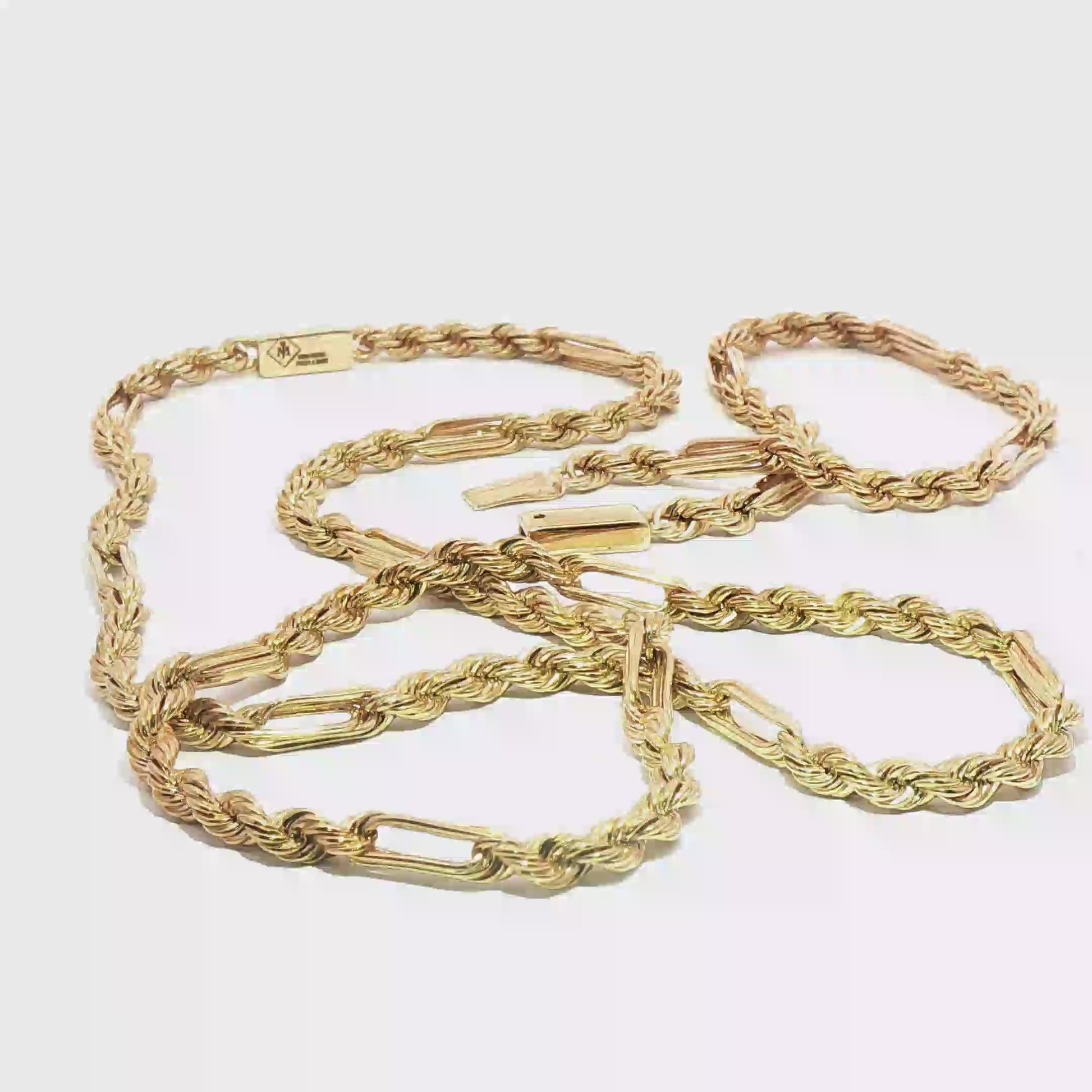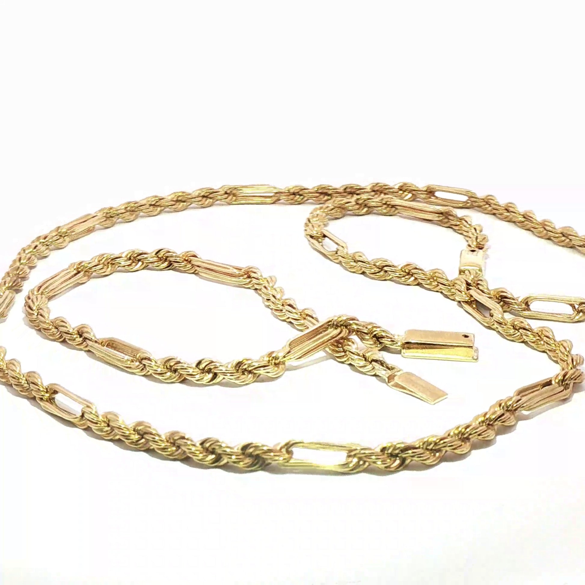 Elevate your style with this exquisite gold chain necklace and bracelet set. The intricate design features a combination of twisted rope links and elongated, rectangular links, creating a unique and sophisticated aesthetic. Perfect for adding a touch of luxury to any outfit. Necklace measures L 20 inch x W 4 mm, bracelet measures L 7 inch x W 4 mm.