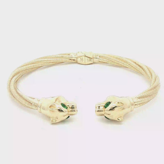 Make a statement with this striking 10K gold bangle bracelet. The design features sculpted panther heads, each adorned with captivating cabochon-cut green zirconia accents.This bangle exudes a bold, luxurious charm, perfect for adding a touch of wild elegance to any ensemble. The quality of the 10k gold makes it a standout accessory. Bangle measures 6 cm in diameter.