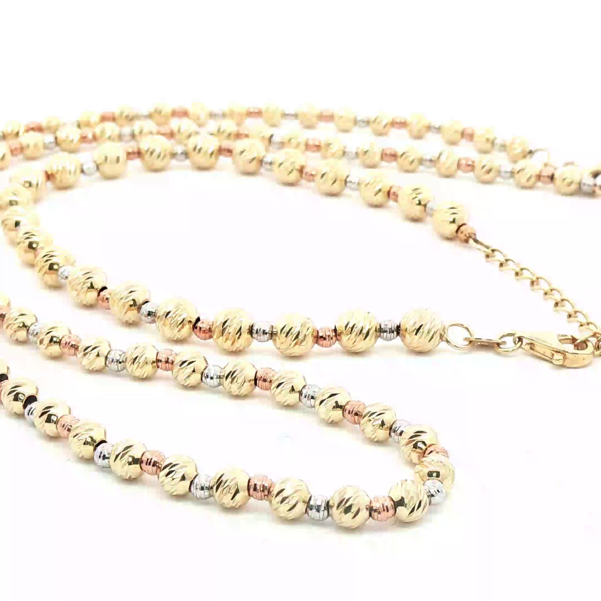 Elevate your style with this exquisite 10K tricolor yellow, pink and white gold beaded necklace and bracelet set. The meticulous craftsmanship of the gold beads creates a radiant and captivating accessory. Perfect for adding a touch of refined elegance to any ensemble. This set embodies timeless beauty and sophistication. Necklace and bracelet came with 2 inch extensor, necklace L 18-20 inch x W 3 mm, bracelet L 7-9 inch x W 5mm.