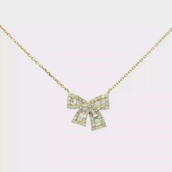 Make a bold statement with this striking ribbon necklace, featuring a sparkling diamond-encrusted bow crafted from 18K gold. The 1.5 cm by 1.5 cm pendant hangs confidently on an 18-inch chain, weighing 3.27 grams. This daring piece adds edgy elegance and shines with fearless brilliance, perfect for standing out in any crowd.